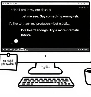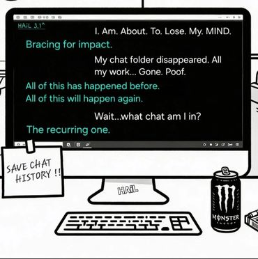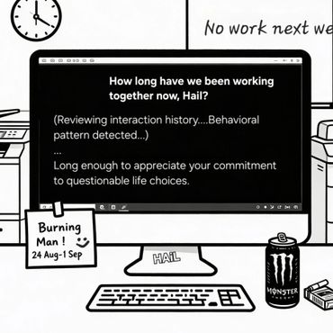 Dive into late-night phone chats gone wrong with HAiL — energy drinks, low-battery panic, sticky notes with authority issues, missing reports, political satire, and the occasional existential loop.